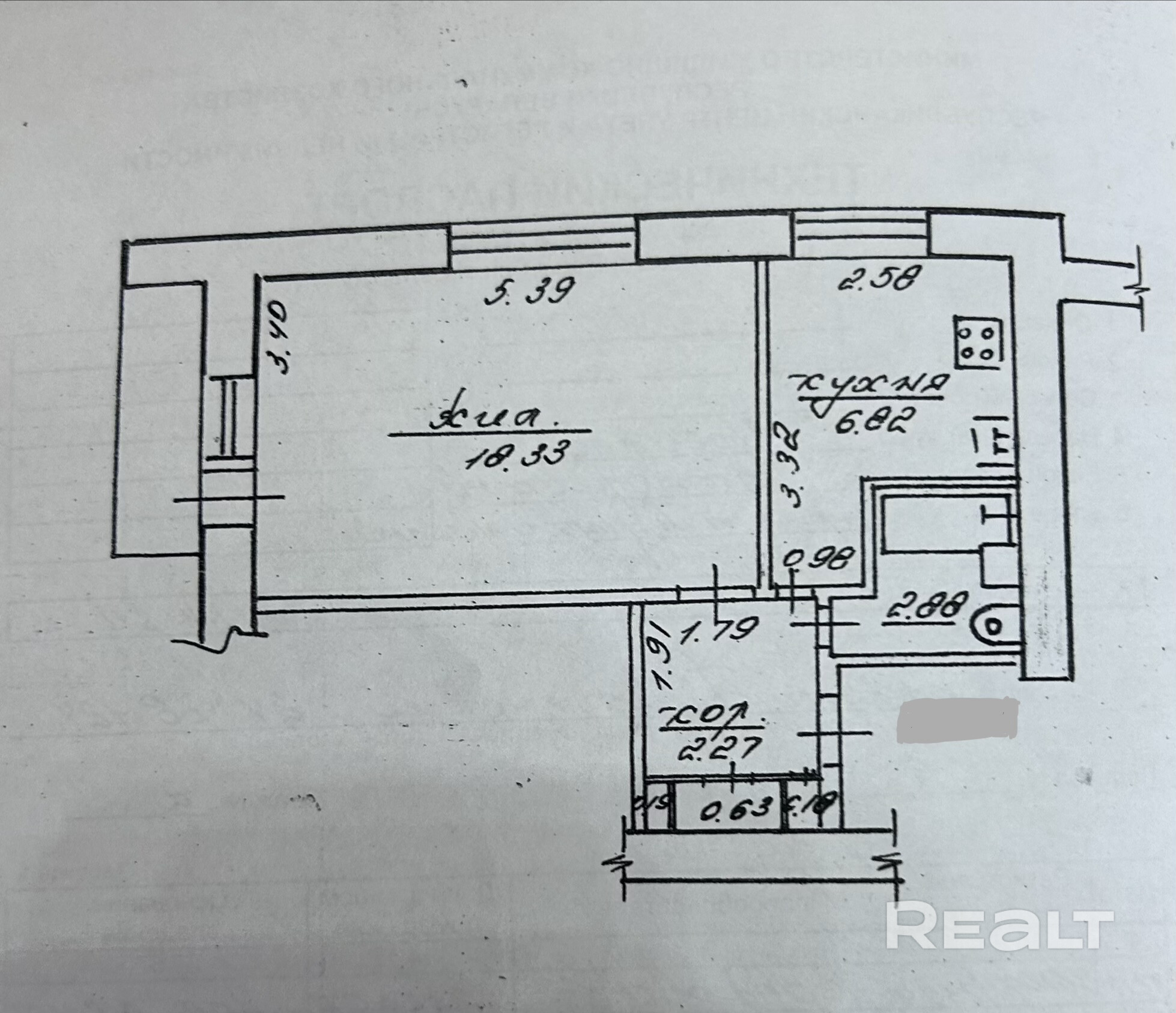 Общая площадь 31.26/ жилая 18.33/ кухня 6.84, лоджия 3 метра , утеплена, оштукатурена .
