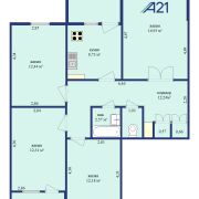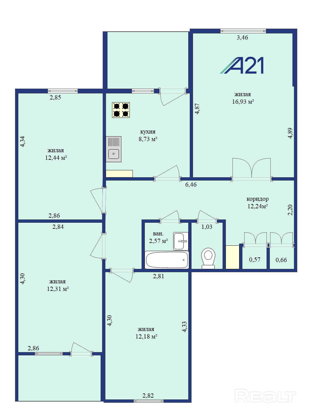 Общая площадь 79,66 кв. м. жилая площадь 53,86 кв. м. кухня 8,73 кв. м. коридор (прихожая) 12,24 кв. м. — огромный, можно поставить шкаф-купе. Зал (гостиная) 16,93 кв. м., 3 комнаты (12.44 кв. м.\12.31 кв. м.\12.18 кв. м.).