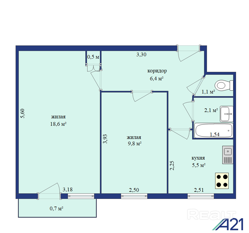 · Комнаты: изолированные, светлые. Площади: 18,6 м2 (гостиная) + 9,8 м2 (спальня/детская).