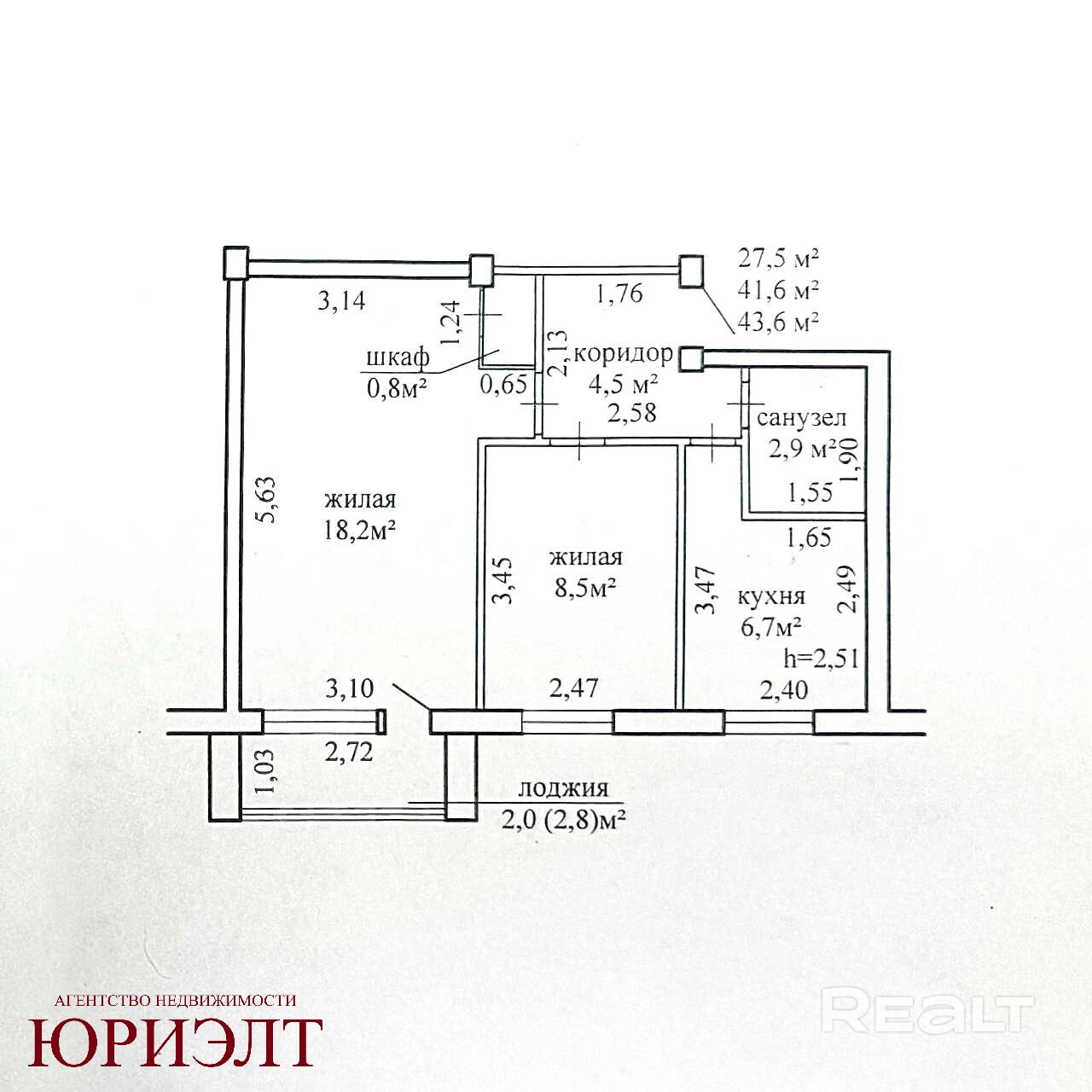 Общая площадь 41.6 м.кв., жилая 27.5 м.кв., кухня 6.7 м.кв.