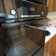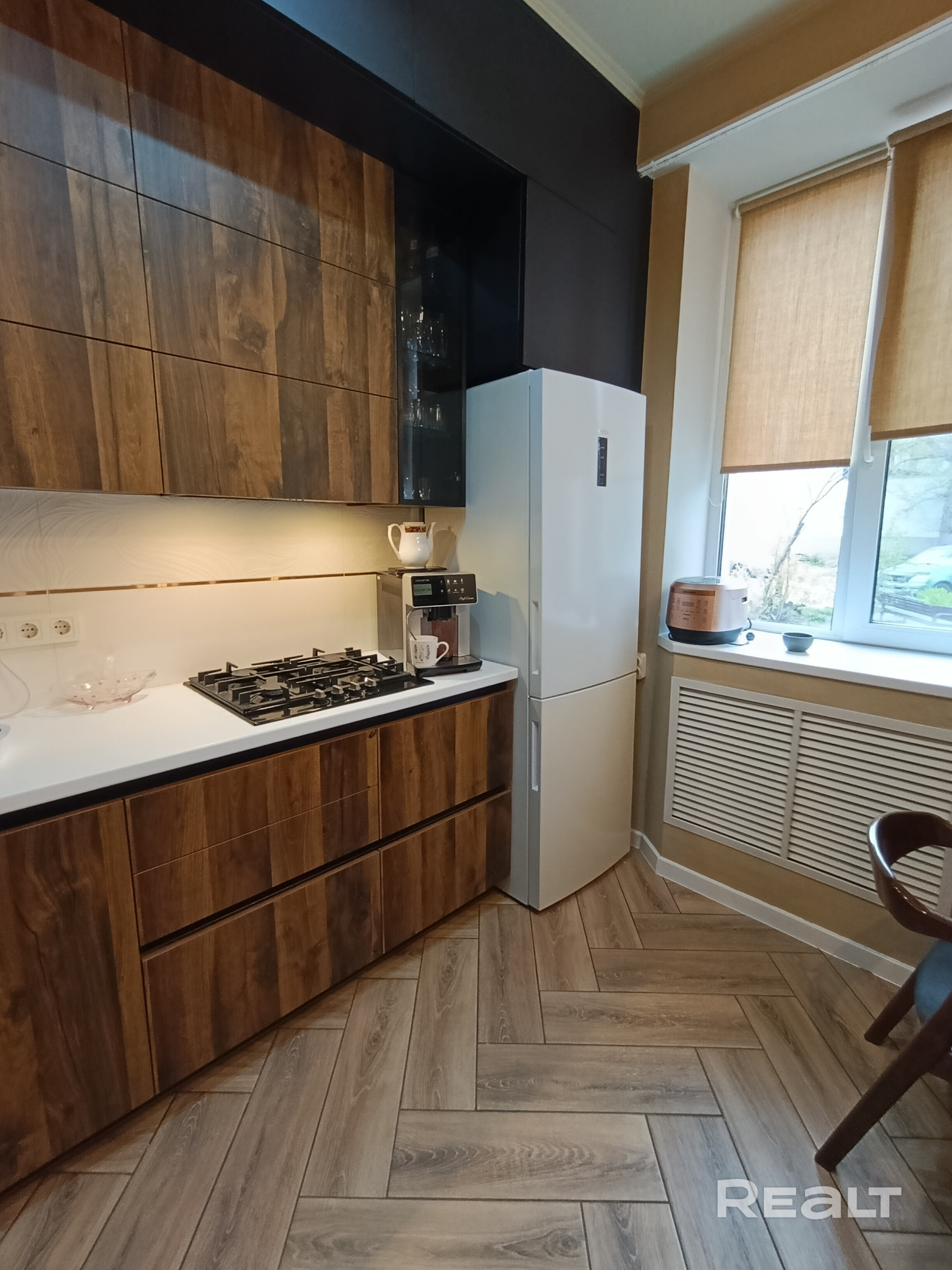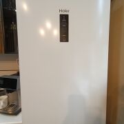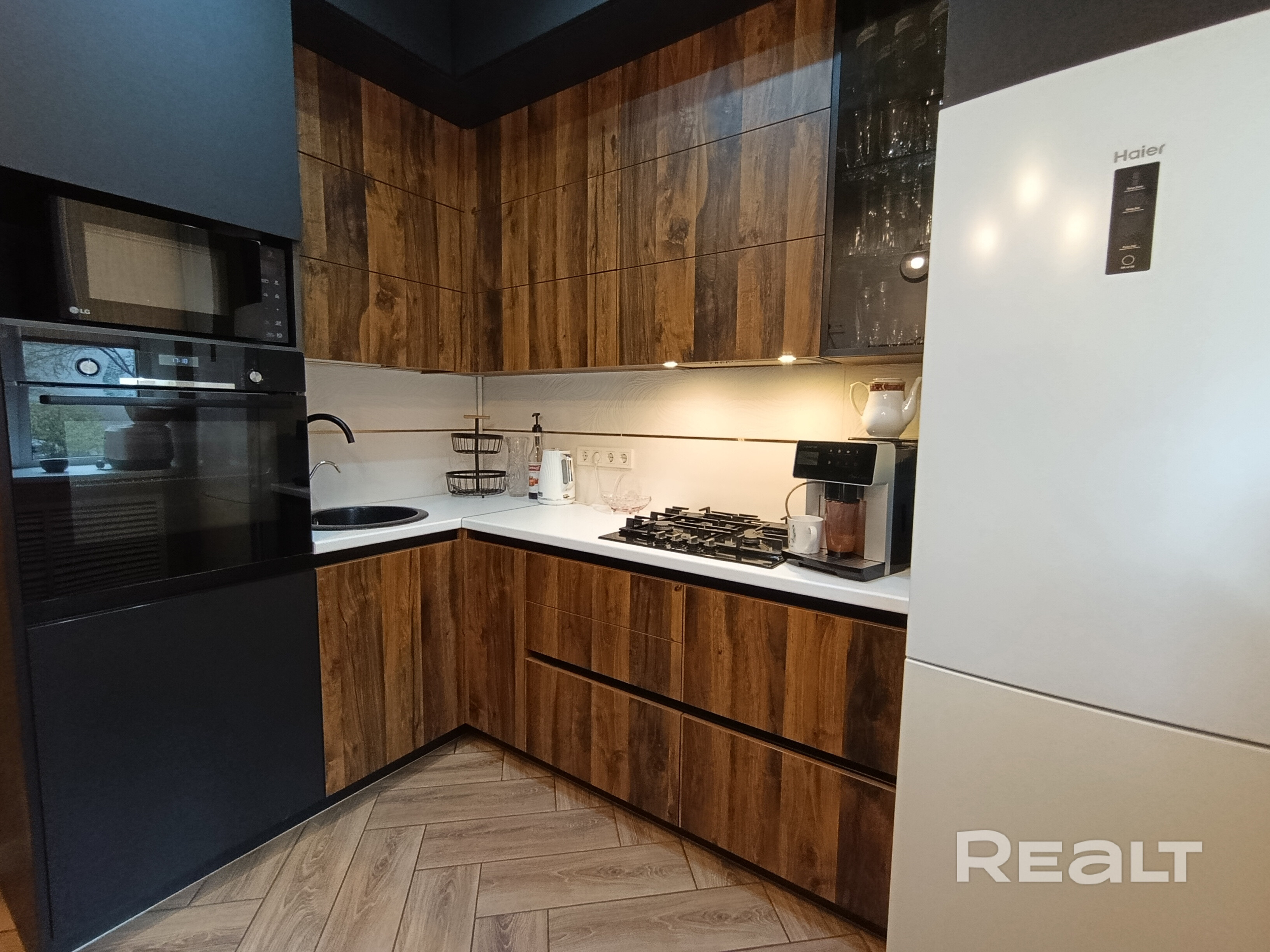 Кухня мечты: стильный гарнитур с фасадами «в потолок» — максимум места для хранения. Использована только надежная фурнитура с доводчиками. Вся техника остается: холодильник Haier, встроенная варочная панель и духовой шкаф Bosch. При продаже остаётся стиральная машина Нaier.