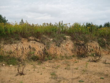 Хорошая дорога заканчивается там, где стоит последний дом, после этого начинается дорога торная. Первое, что бросилось в глаза — небольшой овражек, который со временем придется разравнивать. Скорее всего, там кто-то брал песок для стройки.