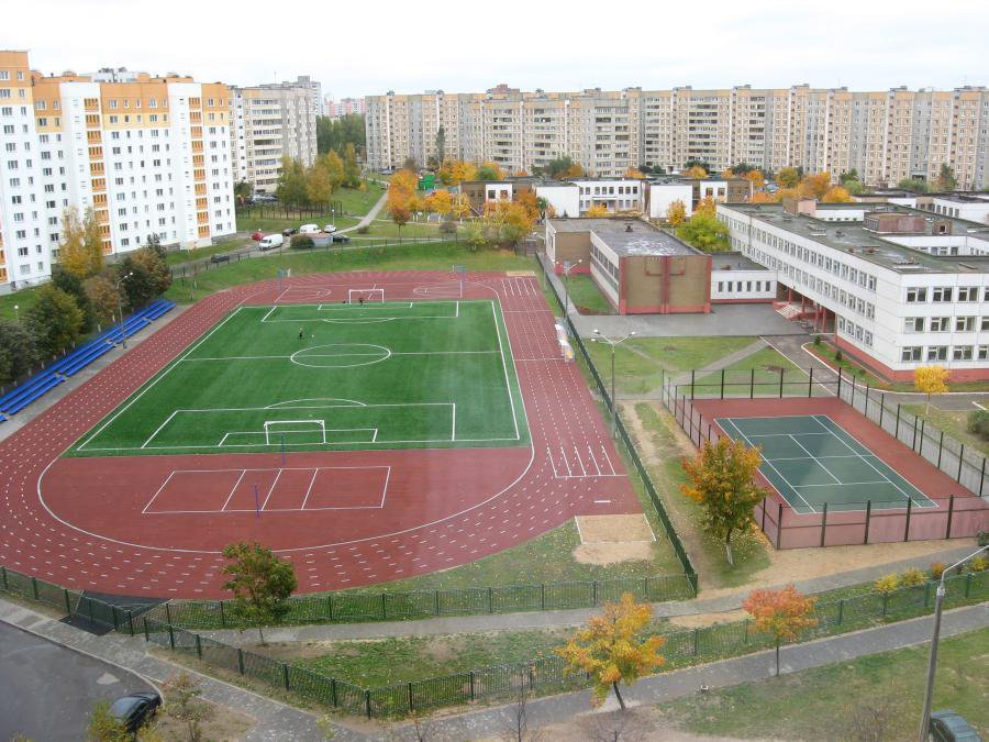 В районе были запроектированы две школы: на 40 и 44 класса. Одна из них, входящая в первый жилой комплекс, уже превратилась в Гимназию № 16.Совсем недавно закончилась ее реконструкция, в результате которой гимназия получила новый корпус, где разместился бассейн. Редкая минская школа может похвастаться бассейном.