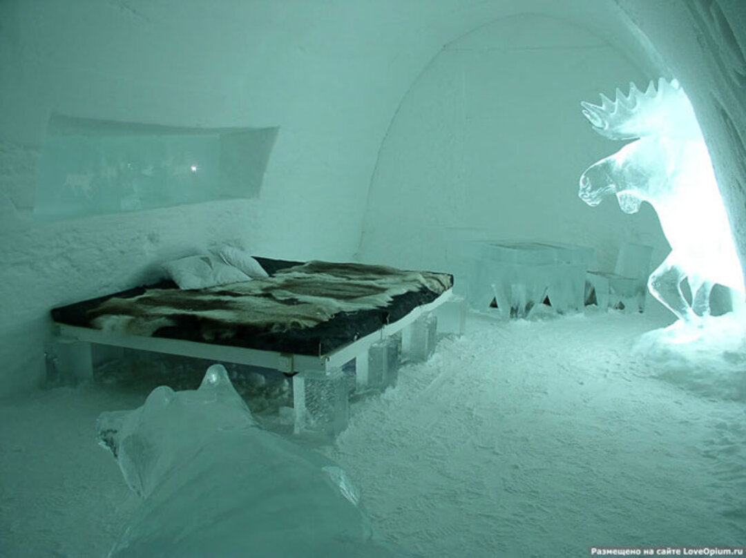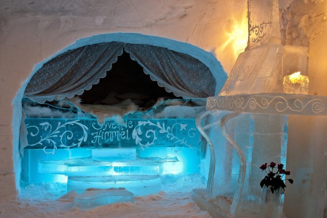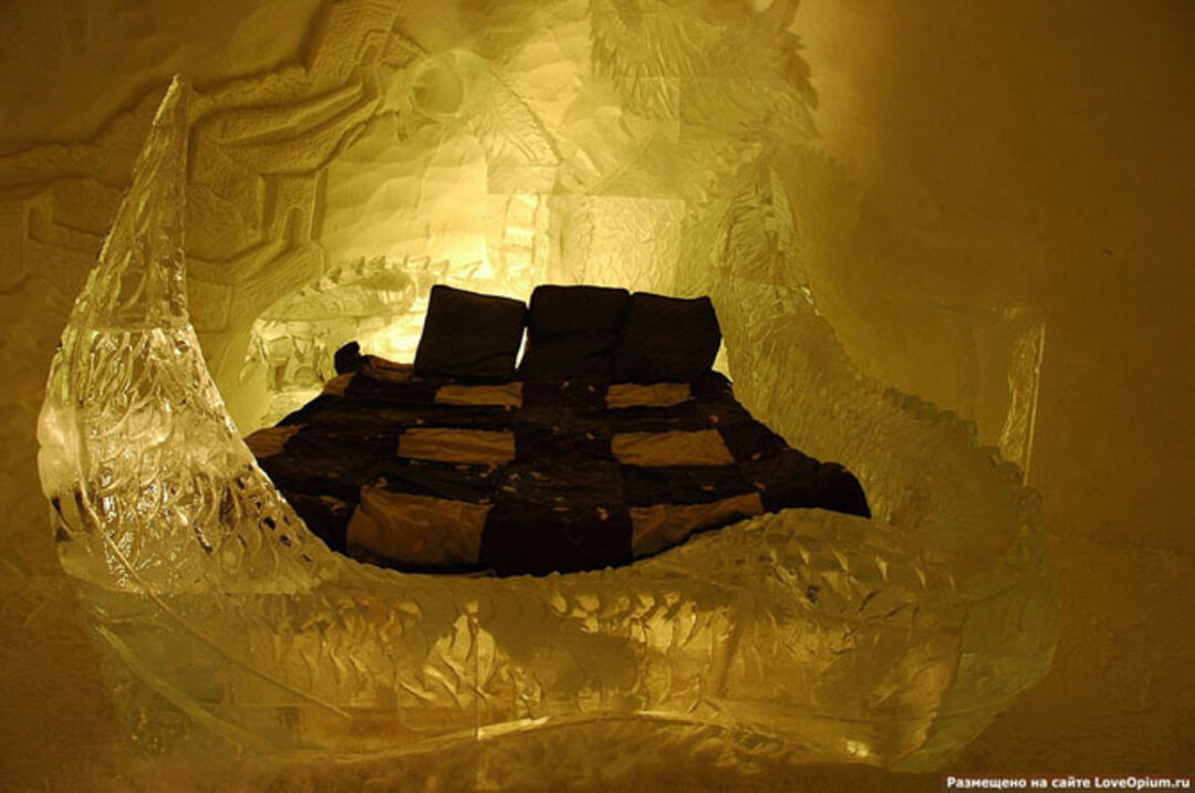 Этот ледяной замок попал в Книгу рекордов Гиннеса, как самый большой в мире. Его площадь достигает 20 тысяч квадратных метров. Гостям предлагается 18 номеров: два групповых (5 кроватей), двухместные, одноместные, а также специальный номер для молодоженов. Стоит упомянуть о том, что помимо прохладцы, в отеле отсутствует ванные комнаты. Все банные процедуры гости вынуждены совершать в соседней гостинице.