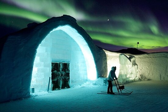 Это и есть тот самый знаменитый первый ледяной отель. Ежегодно, начиная с 1990 года, он возводится в Шведском городке Юккасъярви, в 200 километрах от Полярного круга. Каждую зиму его строят заново, ведь срок годности такого строения всего 4 месяца. Три тысячи тон льда и снега уходит на возведение отеля. Строительный материал заимствуется в ближайшей реке Турни-Эльв.