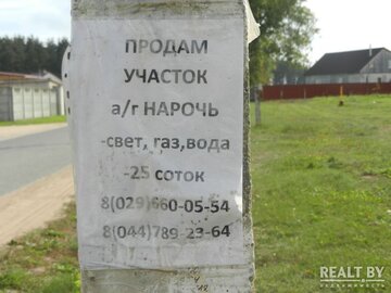 Если погулять по улицам агрогородка Нарочь, то можно увидеть объявления и о продаже земельных участков. Например, бросился в глаза вот этот по ул. Партизанской.