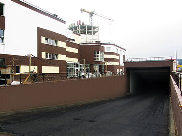 Ведь все мы знаем шумные рампы, катающиеся погрузчики… Это было бы слишком шумно и некомфортно жителям комплекса. Поэтому было найдено новое уникальное решение — разместить рампу под землей.