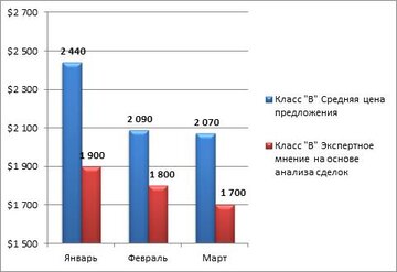 Схожая ситуация и на вторичном рынке. Непрофильных инвесторов на рынке мало, а компании, которые ранее планировали приобрести офисы, в итоге решили их арендовать. Цены предложения на вторичном рынке бизнес-центров B-класса снизились с начала года на 18% — до $ 2070 за кв.м. Объекты C-класса при этом подешевели на 21% — до 1800 за «квадрат». Рыночные цены при этом на 20−30% ниже тех, что фигурируют в предложениях.