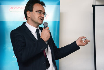 Следующим выступил директор фирмы «BudMat» Анджей Пухальски (Польша, г. Плоцк), партнер белорусского предприятия ООО «РоялРуф». Он выступил с докладом на тему «Инновационная самокалибрующаяся металлочерепица: опыт применения в Польше и Беларуси».