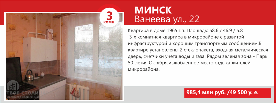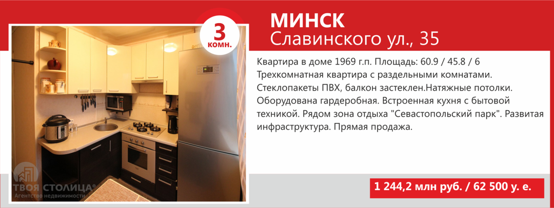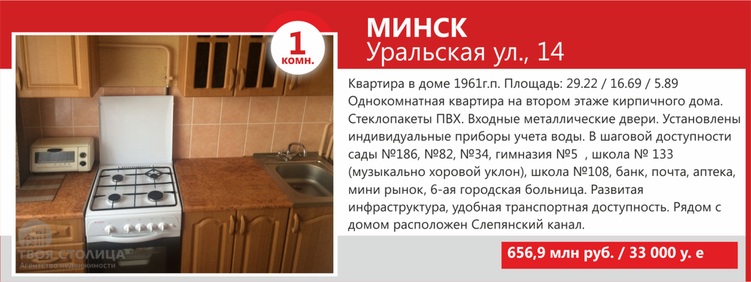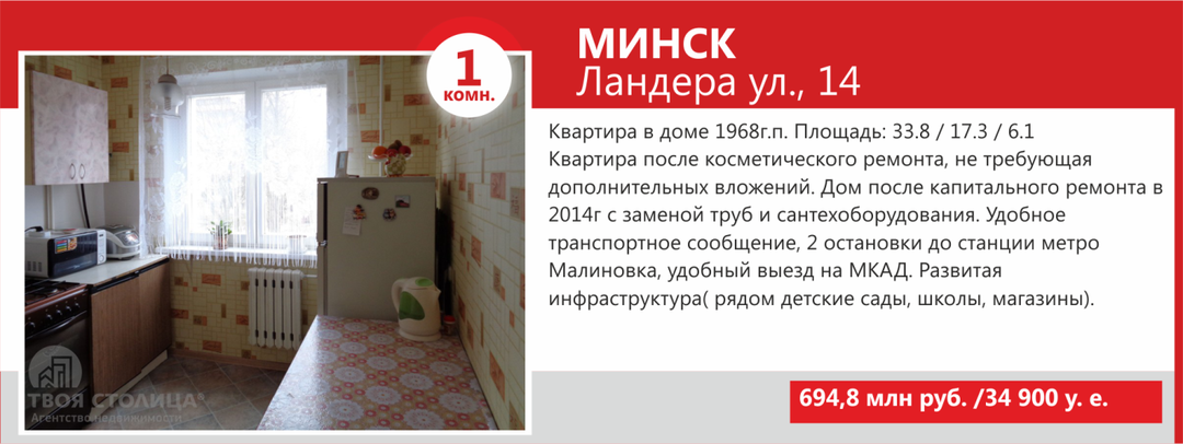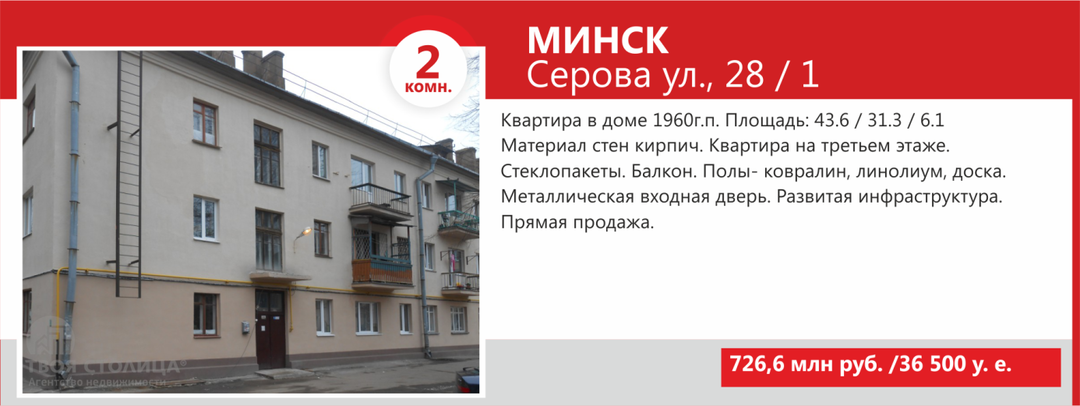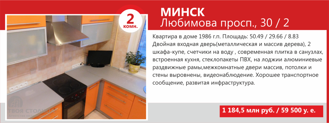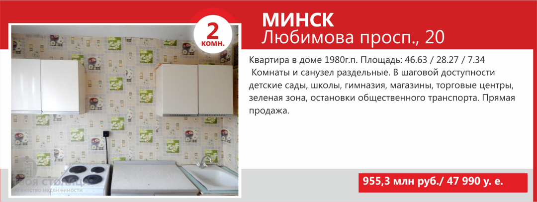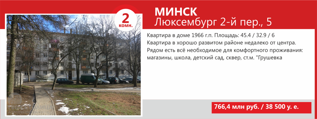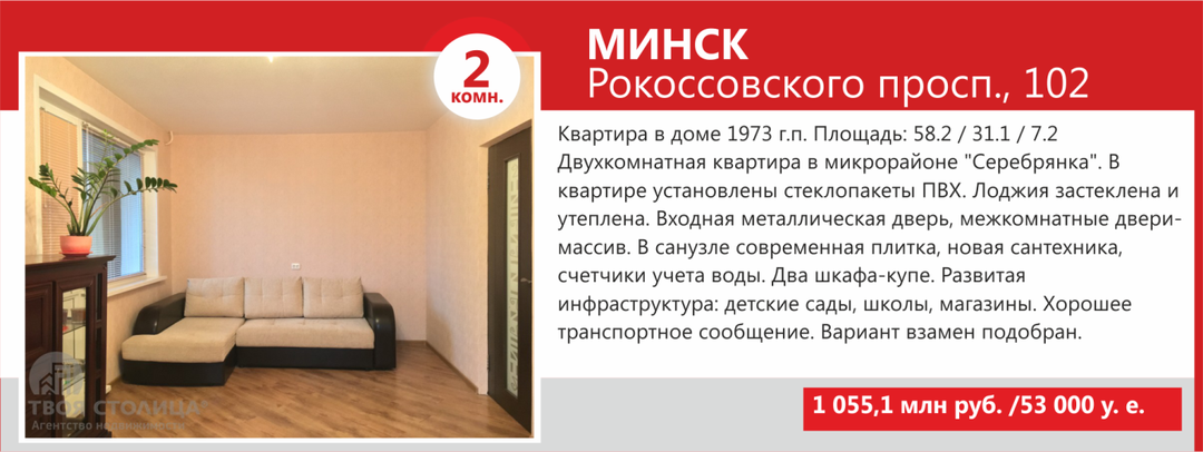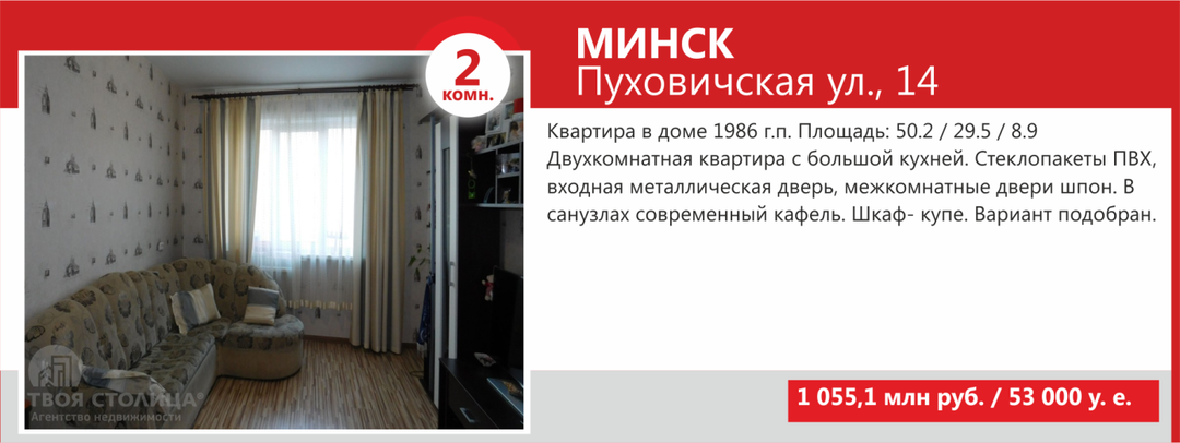 Минимальные стоимости двухкомнатных квартир Минска не намного выше однокомнатных — в базе агентства «ТВОЯ СТОЛИЦА» предложение «двушек» стартует от USD36 500. За такую цену продаются квартиры старого жилого фонда, так называемые «хрущевки» и «брежневки», общая площадь которых составляет порядка 27 кв. м, а кухни — 4−5 кв.м.