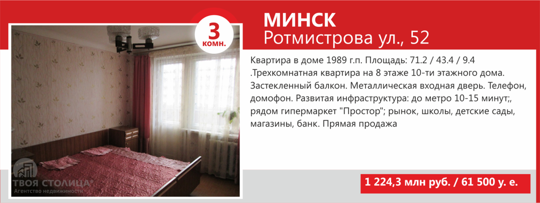 Что касается трехкомнатных квартир, то сегодня их стоимость начинается от USD50 000 — за эти деньги можно купить приличную квартиру в домах от 60-х гг. постройки. «Трешки» стандартных потребительских качеств стоят от USD55 000, а готовую к проживанию трехкомнатную можно купить по цене от USD60 000.