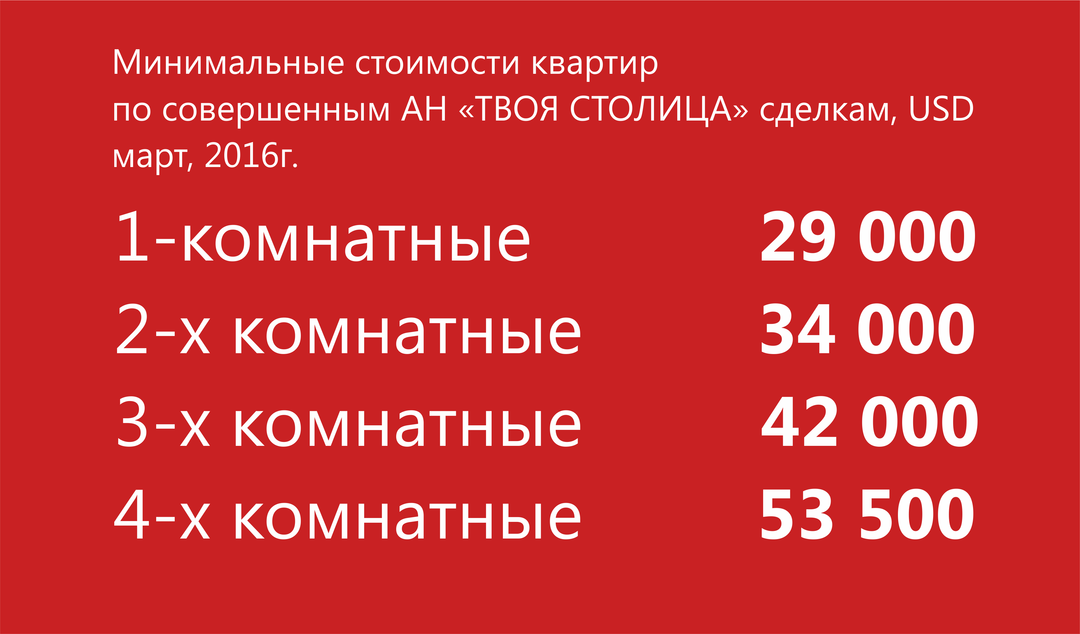 Выросший за зиму — весну объем предложения квартир оказал существенное влияние на снижение цен во всех сегментах рынка жилья, будь то квартиры стандартных потребительских качеств, квартиры с ремонтом и мебелью (готовые к проживанию) или элитные квартиры. В продаже появилось жилье по невероятно низкой стоимости: например, в марте минимальная цена однокомнатной квартиры составила всего USD29 000. Но следует понимать, что приобретенная за такие деньги жилплощадь требует дополнительных материальных вложений на проведение ремонта.