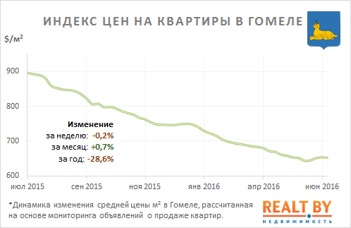 701За неделю с 20 по 27 июня 2016 года информационно-аналитическим центром Realt.by были отмечены следующие изменения на вторичном рынке жилья города Гомеля: