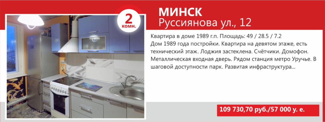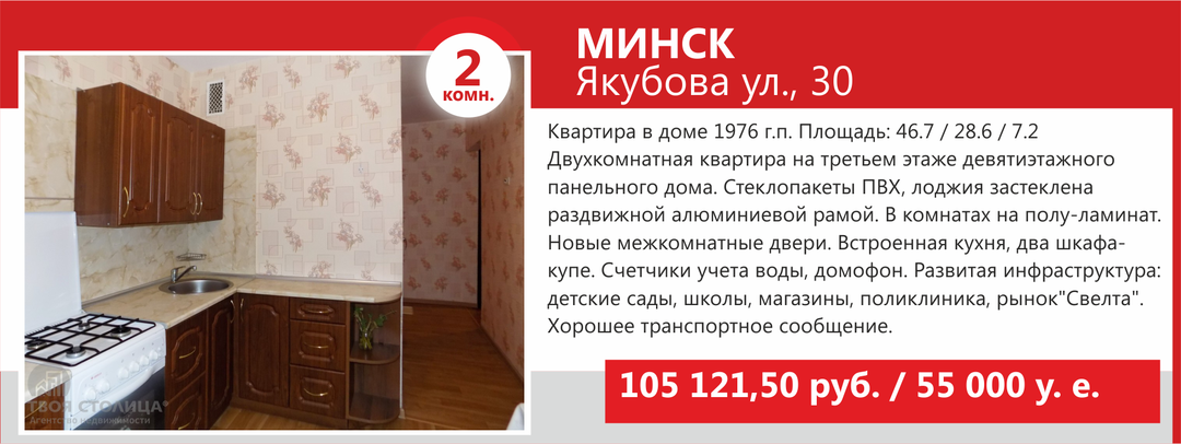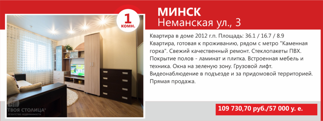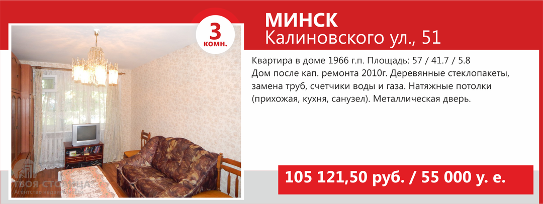 — Сегодня в большинствe заявок, которые мы получаем, фигурируют запросы на квартиры стоимостью $ 40−50 тысяч, — говорит заместитель директора по продажам на вторичном рынке жилья агентства недвижимости «ТВОЯ СТОЛИЦА·АГЕНТСТВО НЕДВИЖИМОСТИ» Светлана Куделко. — И если в конце 2015 года за эту сумму мы могли предложить только однокомнатные квартиры в Минске, то теперь покупатели, имеющие на руках $ 50 000, рассматривают приобретение двух- - трехкомнатных квартир в столице и ближайшем пригороде.