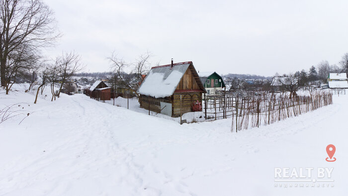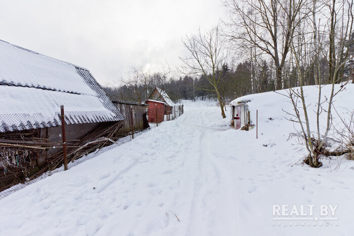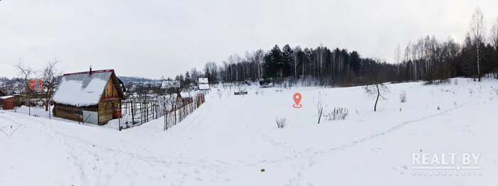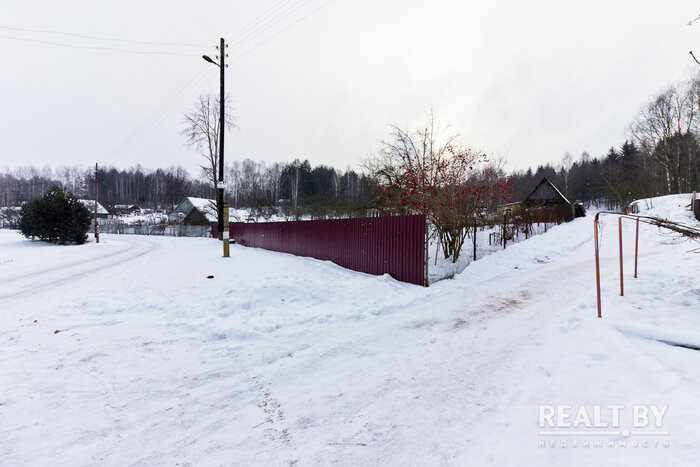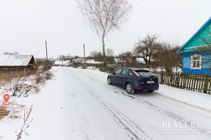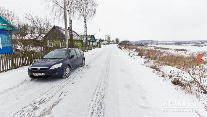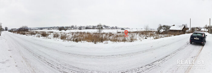Участок ровный, чуть в низине по отношению к проезжей части. Справа находится ветхий домик, площадка слева пустует, за участком пустырь. В деревне преимущественно простые сельские дома. Подъезд под снегом распознать непросто, но, скорее всего, приличная гравийка. Из коммуникаций заявлен газ.