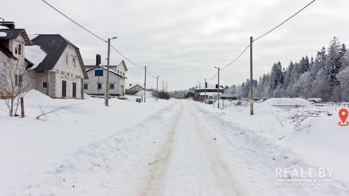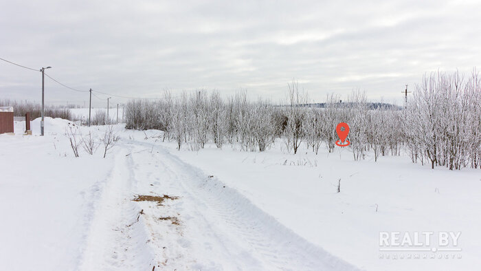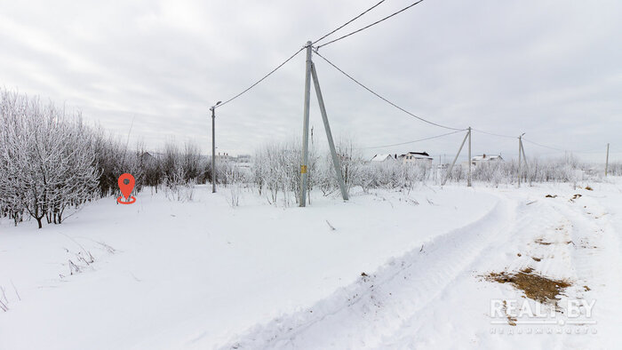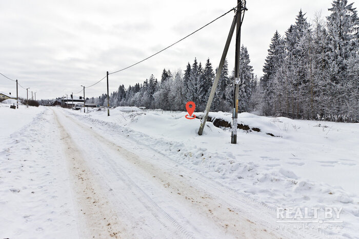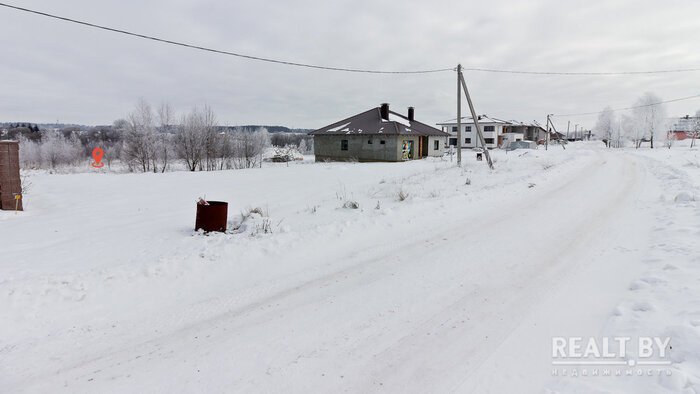 Очередной участок выделен в квартале новой коттеджной застройки в агрогородке Новоселье. Площадка ровная, но заросшая кустарником. Подъезда к территории нет. Из коммуникаций имеется только электричество. Справа от участка — жилой дом, земельный надел слева пока пустует. Большинство соседей в квартале строится.