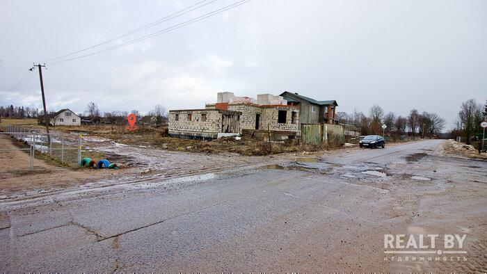 Вакантная площадка низкая, болотистая, выделена во второй линии от дороги, аккурат за недостроенным коттеджем. К участку ведет асфальтированная улица, лишь последние несколько метров придется преодолеть по накатанной дороге. Из коммуникаций здесь есть все необходимое — электричество, газ и водопровод.