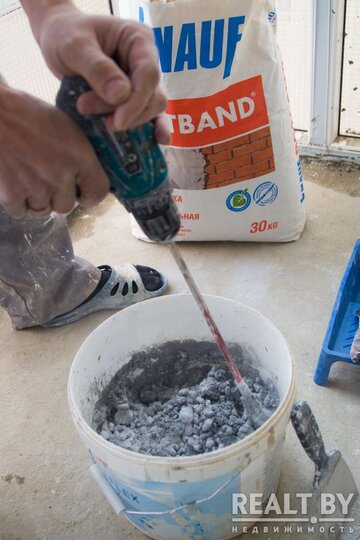 Первый этап — это замес материала. Петр подсказывает, что замешивать нужно небольшими порциями, так как гипсовая штукатурка «схватывается» достаточно быстро. Берем большое ведро, наливаем в него четверть объема воды и постепенно добавляем штукатурку, размешивая строительным миксером либо шпателем. Смесь должна напоминать мокрый песок, она не должна быть однородной. Комки должны быть! В противном случае нужного эффекта мы не добьемся.