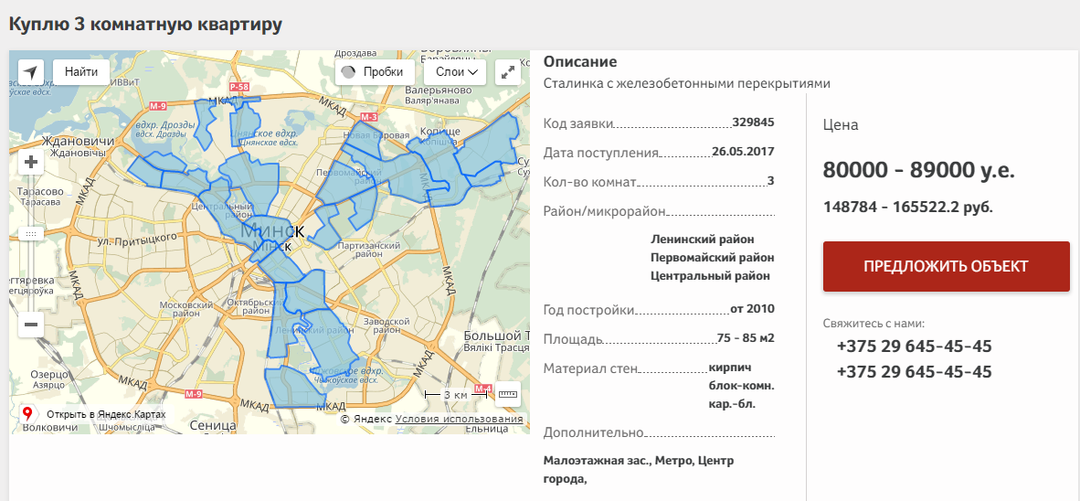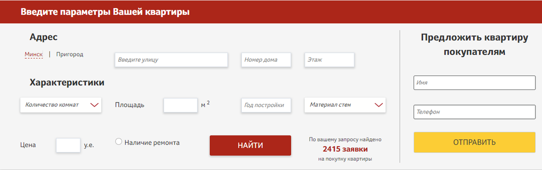 4210Более 2000 объявлений от покупателей квартир в свободном доступе — это не шутка. И не просто оставленных и забытых на портале, а проверенных и уточненных. База покупателей на сайте www. t-s.by — бесплатный сервис для оценки спроса на имеющуюся квартиру. Проверенные покупатели и удобные сроки продажи — реальная возможность вместе с «ТВОЯ СТОЛИЦА∙АГЕНТСТВО НЕДВИЖИМОСТИ»!