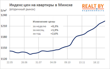 Начало нового года прошло под знаком роста цен на столичную жилую недвижимость. Индекс цен на квартиры в Минске вырос за неделю на 0,3% и составил 1224 $/м2.