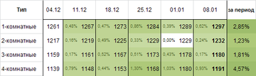 Цены на различные типы квартир за неделю претерпели следующие изменения: