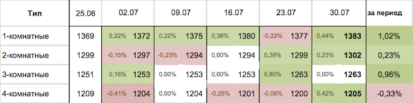 Цены на различные типы квартир за неделю претерпели следующие изменения: