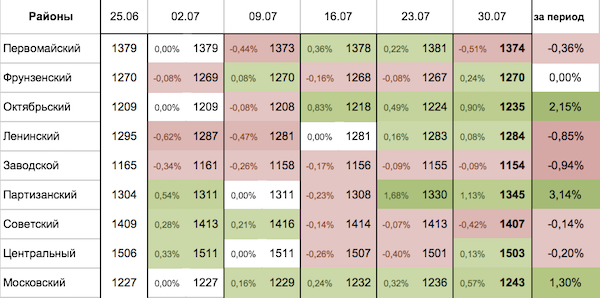 Изменение цен в районах Минска на 30 июля выглядит следующим образом: