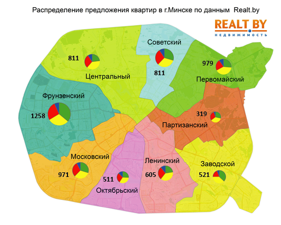 Распределение предложения квартир по районам Минска выглядит следующим образом: