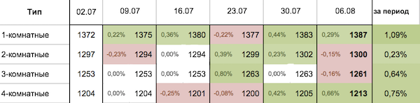 Цены на различные типы квартир за неделю претерпели следующие изменения: