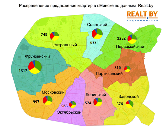 Распределение предложения квартир по районам Минска выглядит следующим образом: