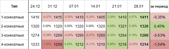 Цены на различные типы квартир за неделю претерпели следующие изменения: