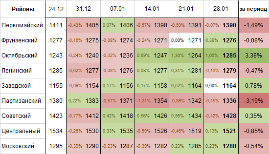 Изменение цен в районах Минска на 28 января выглядит следующим образом:
