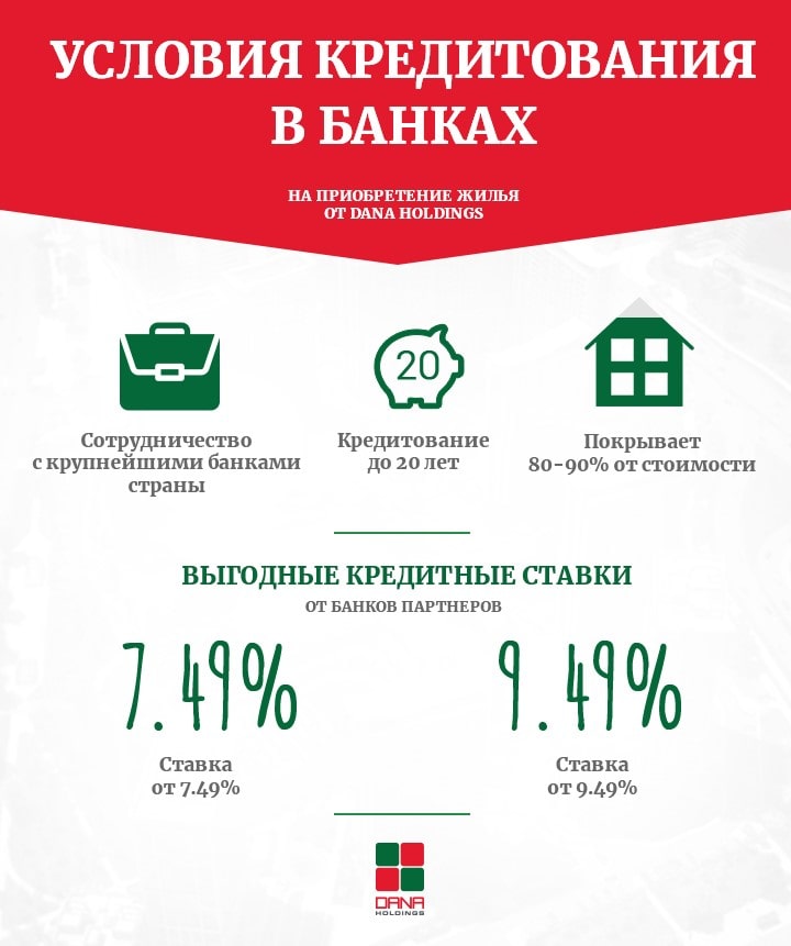 Ну а, если вы всё-таки решите брать кредит для приобретения квартиры, то компания Dana Holdings предлагает не откладывать покупку жилья в «долгий ящик» и сделать это прямо сейчас на выгодных условиях, которые предоставляют банки-партнёры.