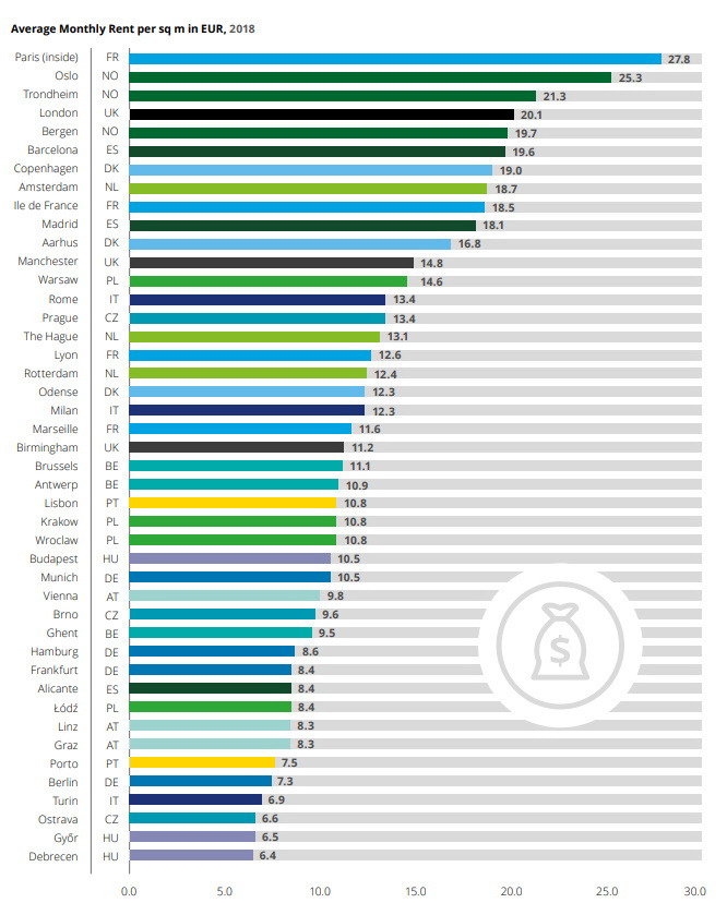 Рынок аренды также попал в подборку Deloitte. Первое место по дороговизне заняла Франция со своей столицей. Чтобы снять квартиру в Париже, нужно заплатить 27,8 евро/кв.м в месяц. Второе и третье место заняли города Норвегии — Осло и Тронхейм (25,3 евро/ кв. м и 21,3 евро/ кв. м в месяц соответственно).