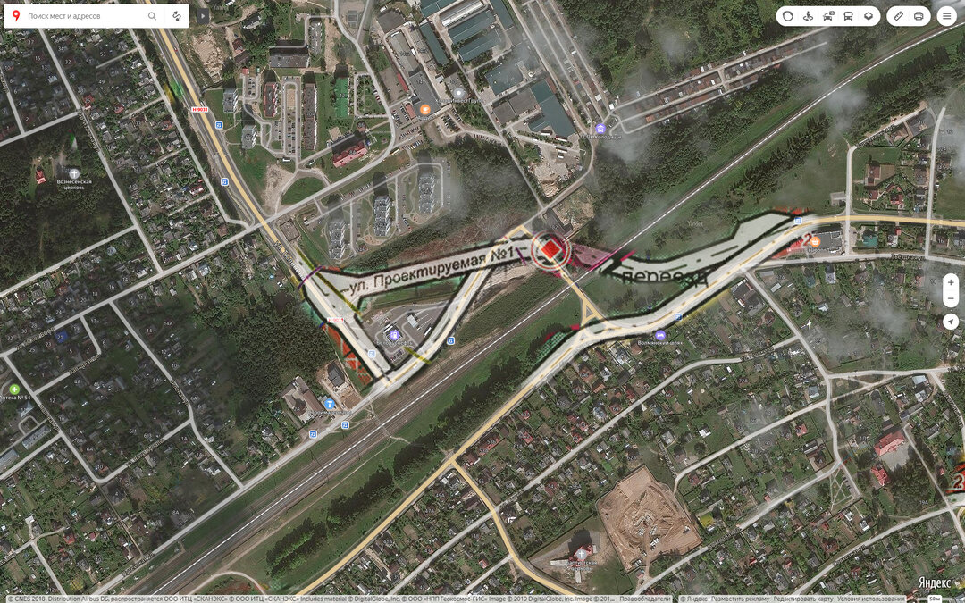 Насыпь путепровода со стороны улицы Волмянский Шлях будет начинаться в районе магазина «Евроопт», мост через железнодорожные пути пройдет немного восточнее того места, где сейчас находится наземный переезд, а со стороны улицы Тюленина путепровод пройдет между АЗС и многоэтажными домами. Мы взяли изображение новой развязки с генплана, который сейчас проходит общественное обсуждение, и наложили на спутниковый снимок: