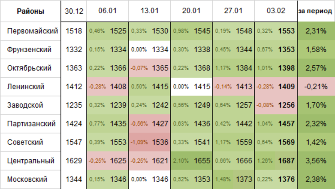 В двух районах по итогам недели зафиксировано снижение цен. В Ленинском оно составило 0,3%, а в Заводском — 0,1%. В остальных районах цены на квартиры росли, максимальные темпы были отмечены в Центральном (+1,3%) и Партизанском (+1%) районах.