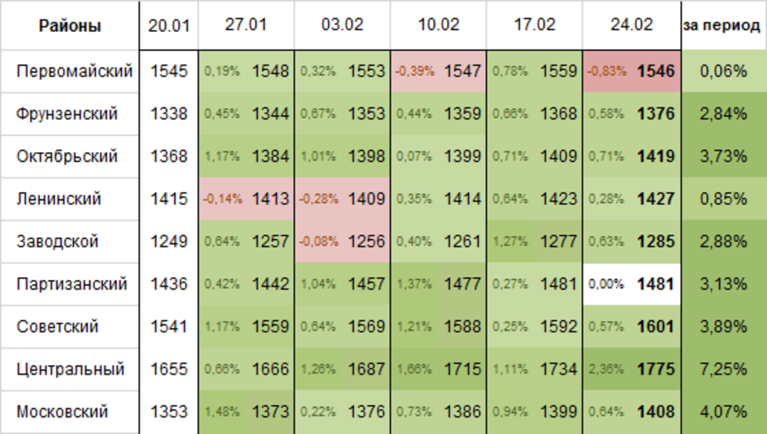 Лишь в Первомайском районе по итогам недели было зафиксировано снижение цен (-0,8%). Для Партизанского района неделя не принесла изменений, в остальных районах цены на квартиры росли. Максимальные темпы были отмечены в Центральном (+2,4%) и Октябрьском (+0,7%) районах.