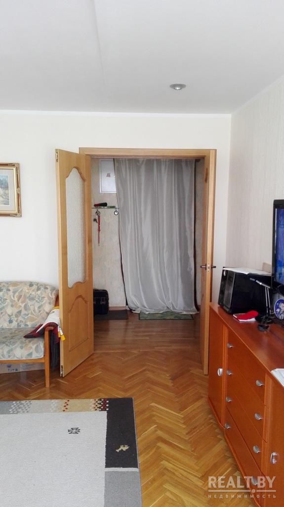 1-комнатная на 4-м этаже, общей площадью 33 кв. м, жилая зона — 21 кв. м, кухня — 6 кв.м. Санузел совмещенный. Полы — паркет. Есть балкон и частично мебель.