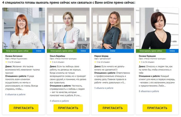 Форма запроса проста и интуитивно понятна. Заполнив несколько окошек, нажимаем «Пригласить эксперта». К слову, познакомиться с каждым из специалистов можно на этой же странице. В информации к агентам указано количество объектов в работе, отзывы и оценки предыдущих клиентов, фото специалиста и девиз по жизни — все это поможет найти «своего агента» для максимально комфортной работы.