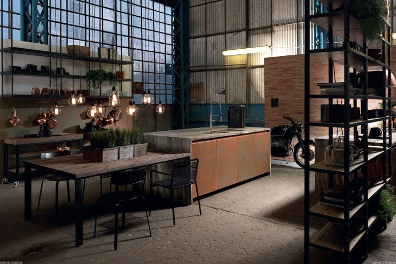 Практичной покажется также кухня, выполненная в индустриальном стиле. Если вам придутся по вкусу такие решения, не забудьте о металлических акцентах — серебряный цвет красиво дополнят черты золотого с розовыми вкраплениями.
