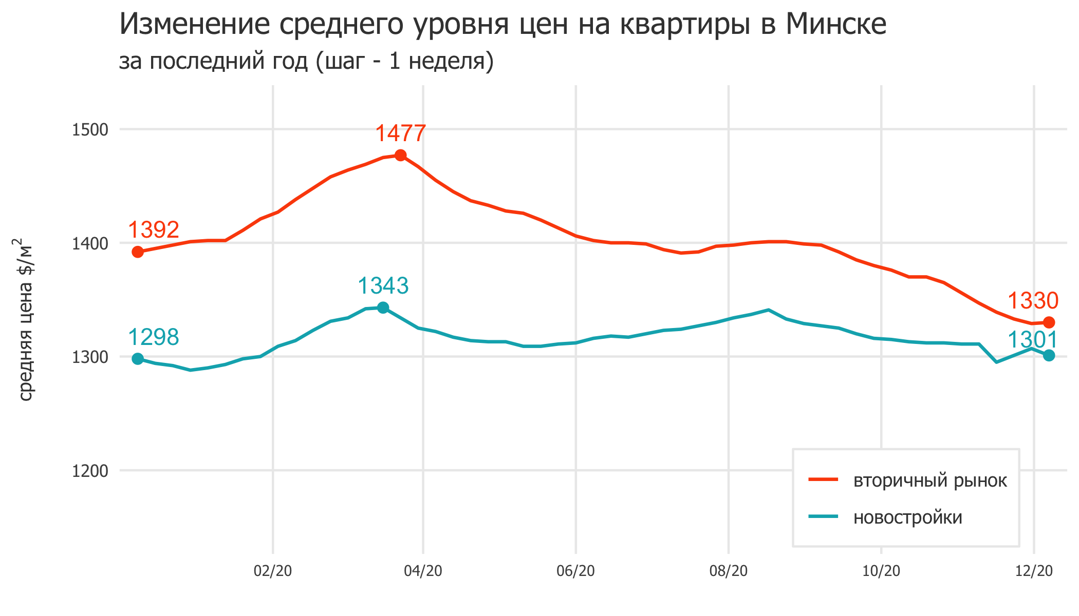Существенных изменений в уровне цен в Минске не произошло: индекс цен вторичного рынка жилья составил 1330 $/м2 (+0.1% за 7 дней).