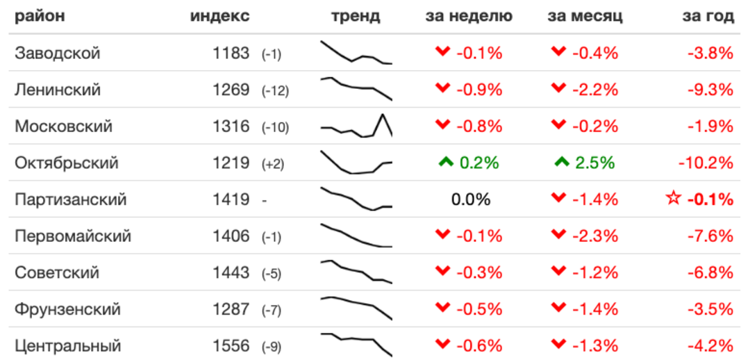 Брест — 818 $/м2 (-0.1%), Витебск — 613 $/м2 (-0.5%), Гомель — 618 $/м2 (-0.6%), Гродно — 716 $/м2 (без изменений), Могилев — 648 $/м2 (-0.6%).