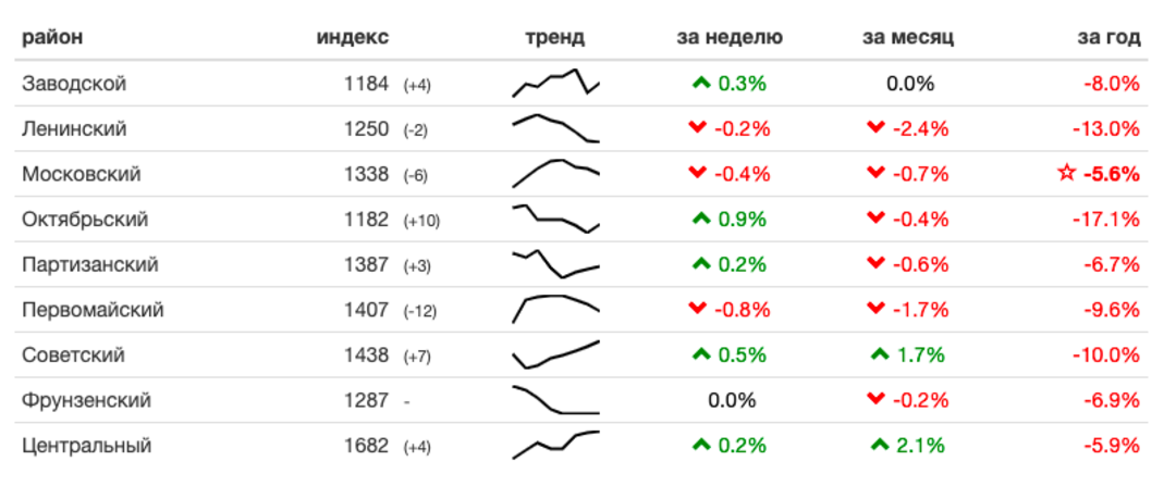 Брест — 799 $/м2 (+0.3%), Витебск — 606 $/м2 (+0.5%), Гомель — 622 $/м2 (+0.2%), Гродно — 702 $/м2 (-0.3%), Могилев — 647 $/м2 (+0.3%).