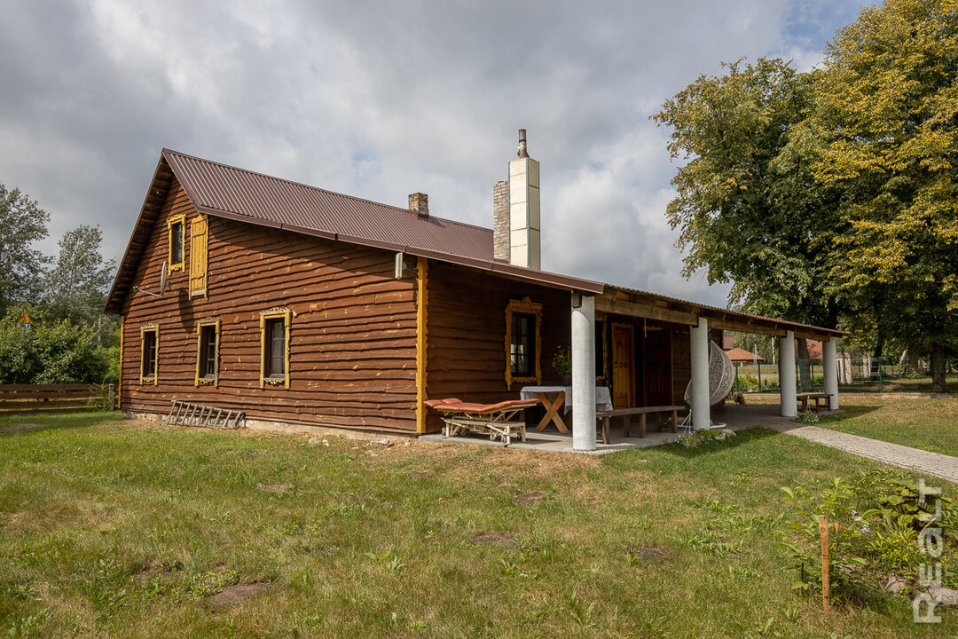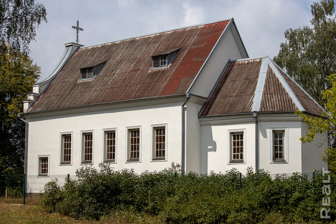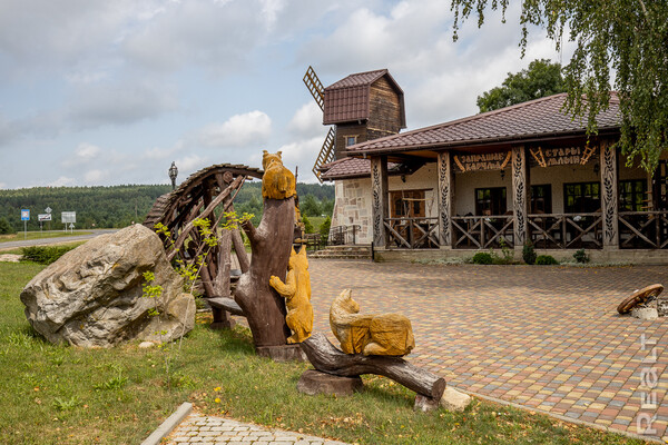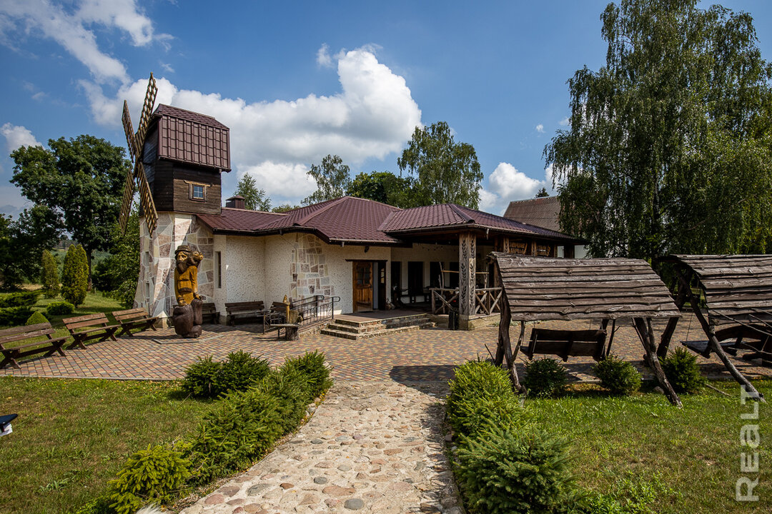 Здание с мельницей возле костела — бывшее придорожное кафе. Сейчас это гостевой домик, в котором также проходят торжества, корпоративы, обедают и ночуют туристы.