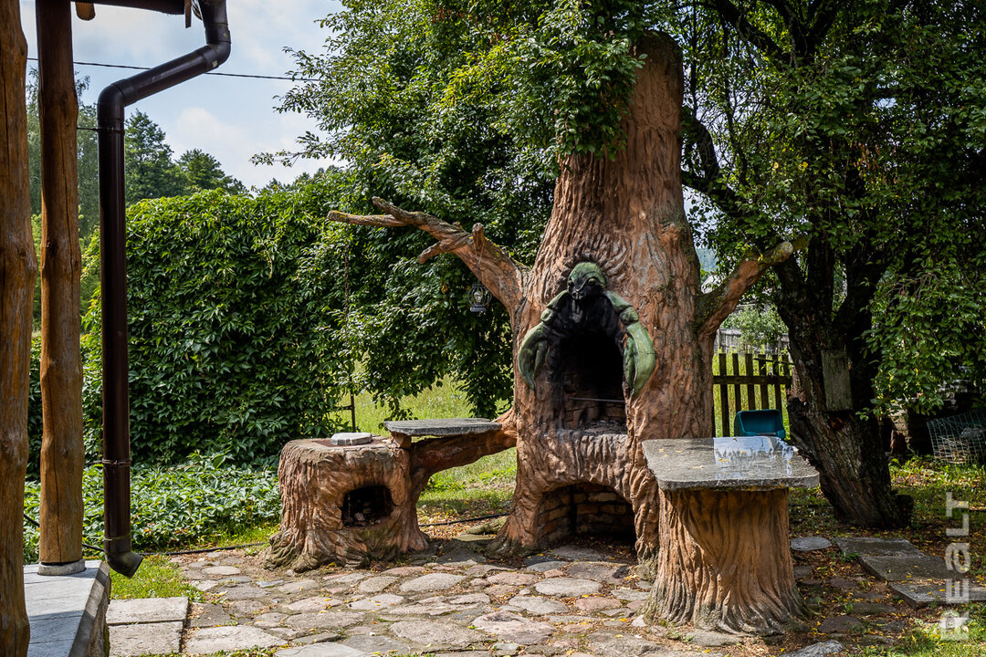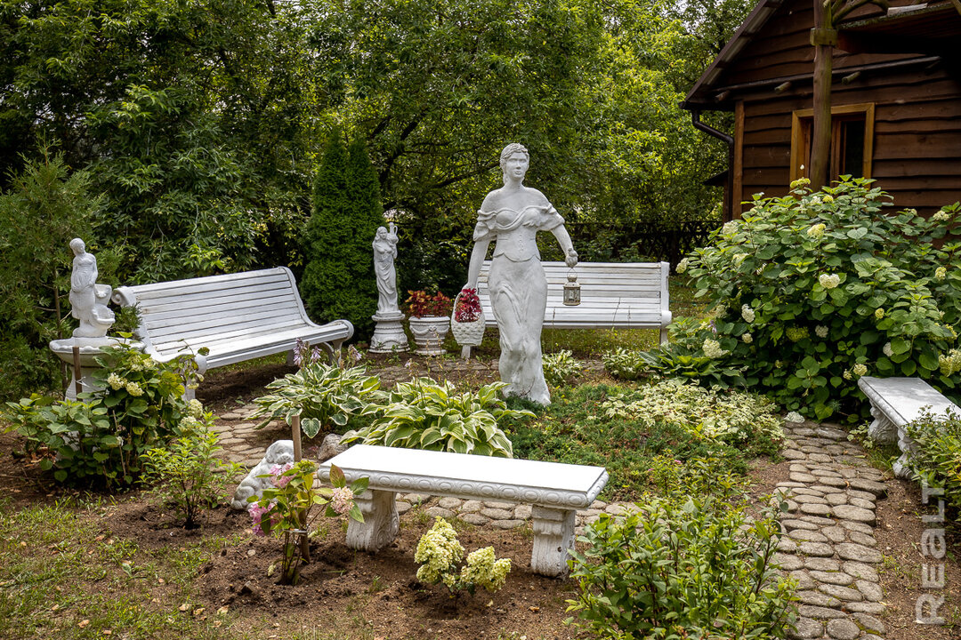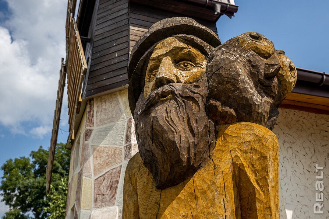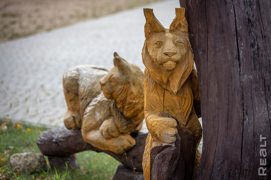По всей агроусадьбе мы то и дело замечаем скульптуры и инсталляции. Янина рассказывает, что очень любит природные материалы — глину, дерево и камень, и изделия из них. Она приглашала белорусских скульпторов из Гродно, Дрогичина, Бреста, Пружан, чтобы проводить мастер-классы, предоставляла дерево, а скульпторы взамен оставляли творения в фальварке.