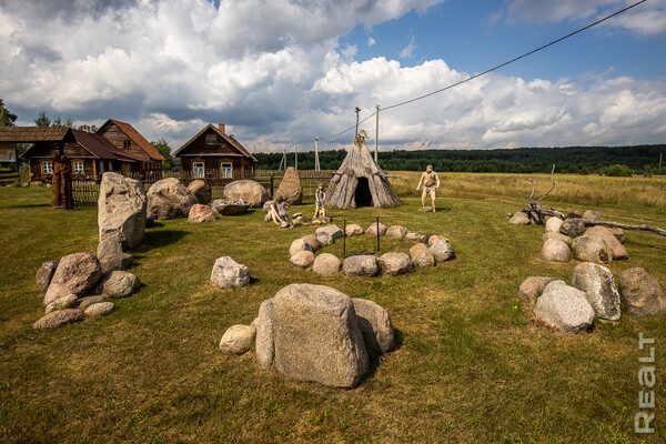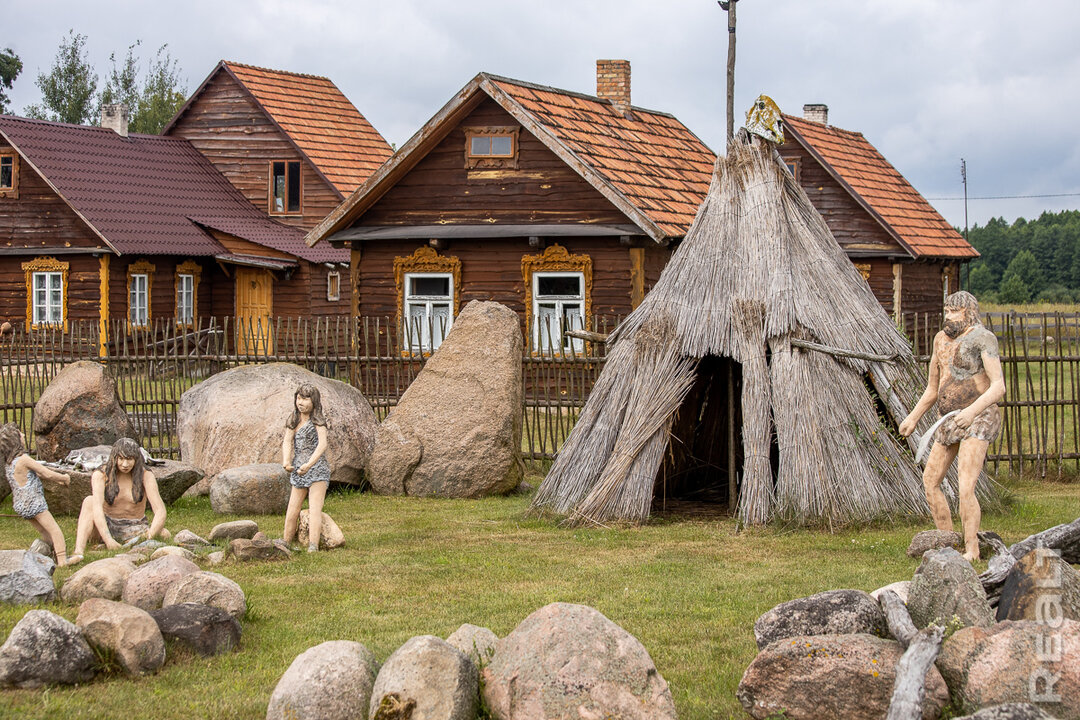 15777Недалеко от Волковыска, между лесов, полей и рекой Россь, находится маленькая деревня Коревичи. Она встречает, когда проезжаешь по трассе Р78, огромными валунами, статуями пещерных предков с их жильем-шалашом, придорожным кафе с мельницей, большой вывеской на деревянных воротах — «Фальварак у Рыся». Агроусадьба на 11 гектаров земли принадлежит семье, которая своими руками за 13 лет почти с нуля построила 11 домиков, возродила историю, национальный быт и традиции, создала этнографическое подворье, контактный зоопарк и все-все для того, чтобы люди окунулись в атмосферу настоящей белорусской деревни…