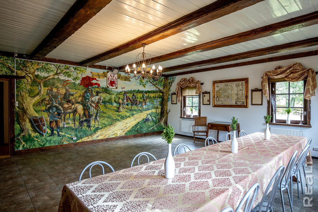 Здание, в котором мы находимся, это бывшая школьная столовая. Большую его часть хозяевам пришлось достраивать. Сегодня здесь помимо рыцарского зала есть пять комнат 11 спальных мест. Домик арендуют для проведения свадеб, которые здесь длятся по три, а то и четыре дня.