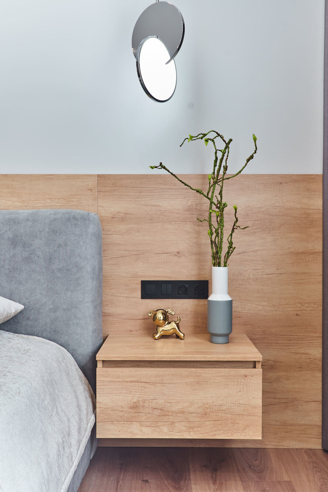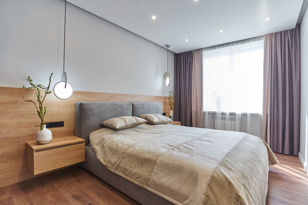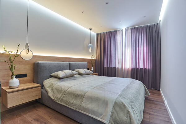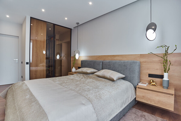 Спальня, как говорят дизайнеры, это место, где работает правило «меньше — лучше». Здесь расположена полноценная гардеробная комната с зеркальной графитовой поверхностью, что позволяет внешне расширить пространство за счет игры отражений. Кровать в мягкой обивке, панель из ДСП с подсветкой и с подвесными тумбами, минималистичные подвесные светильники.