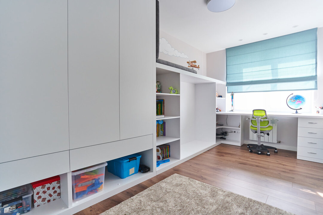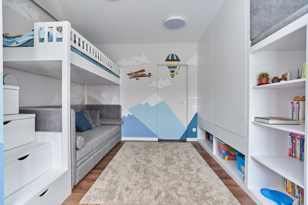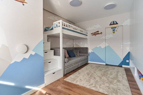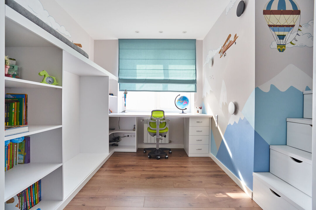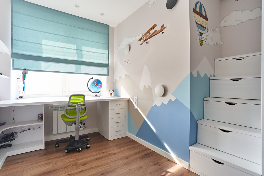 В детской дизайнеры воплотили все «хотелки» ребенка. Кровать сделана из крашеной фанеры, которая считается самым надежным материалом для детских комнат. Стену расписывал художник по референсам от дизайнера студии. В детской все продумано до мелочей — много места для хранения, рабочее место для ребенка.