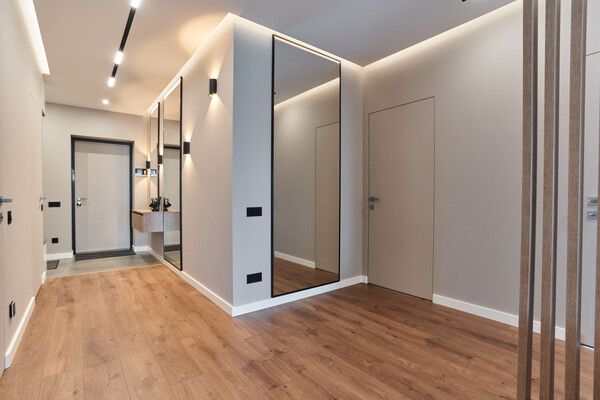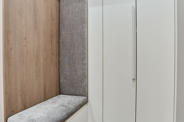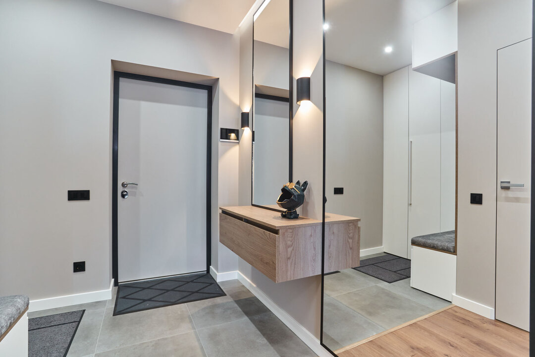 В прихожей, площадь которой 9 м², — навесная тумба и два больших зеркала. Одно из них в пол. Также дизайнеры добавили несколько светильников. Здесь расположен комплект мебели для верхней одежды и обуви, а также гардеробная система. Фасады мебели выполнены из крашенного МДФ.
